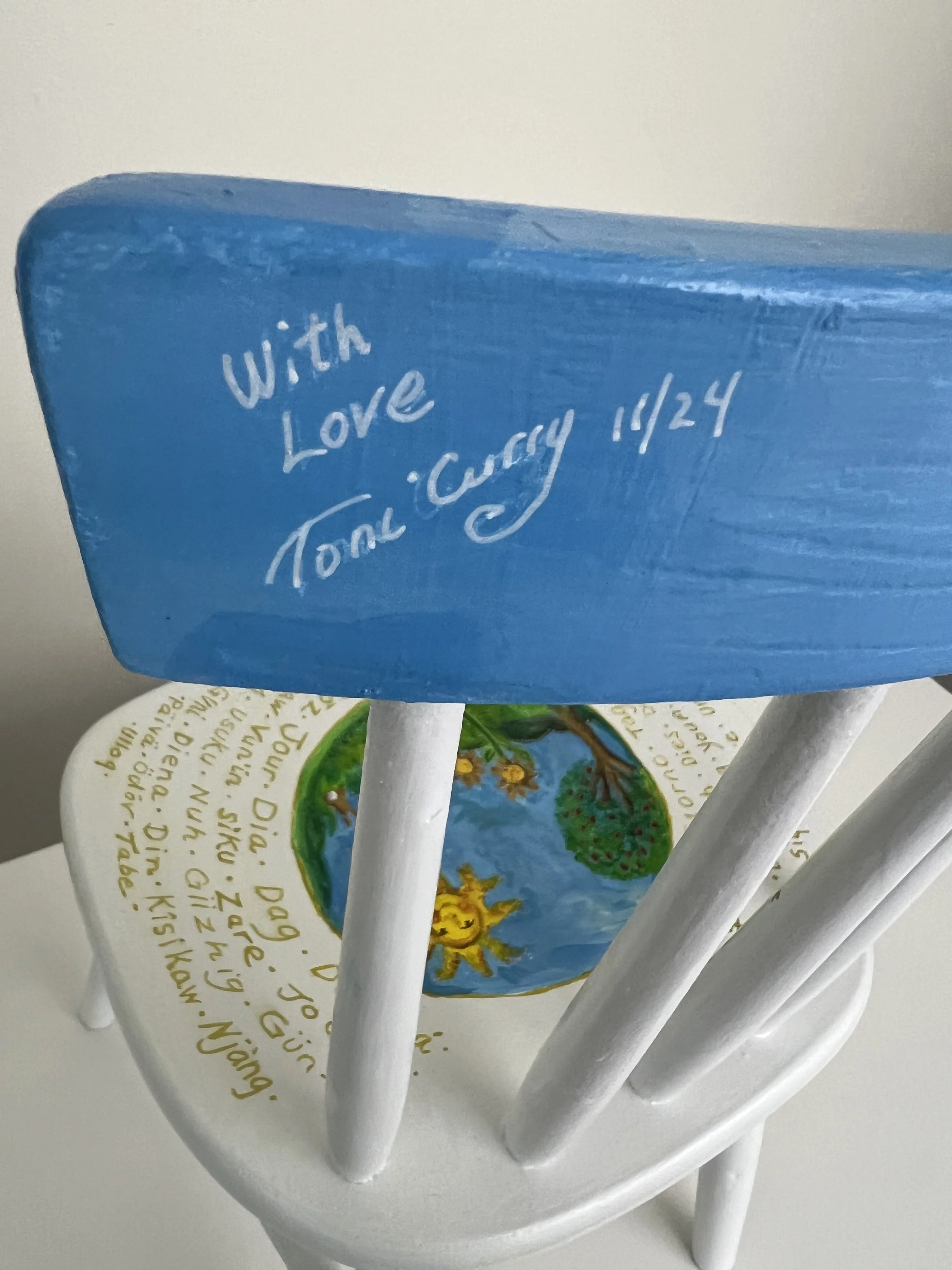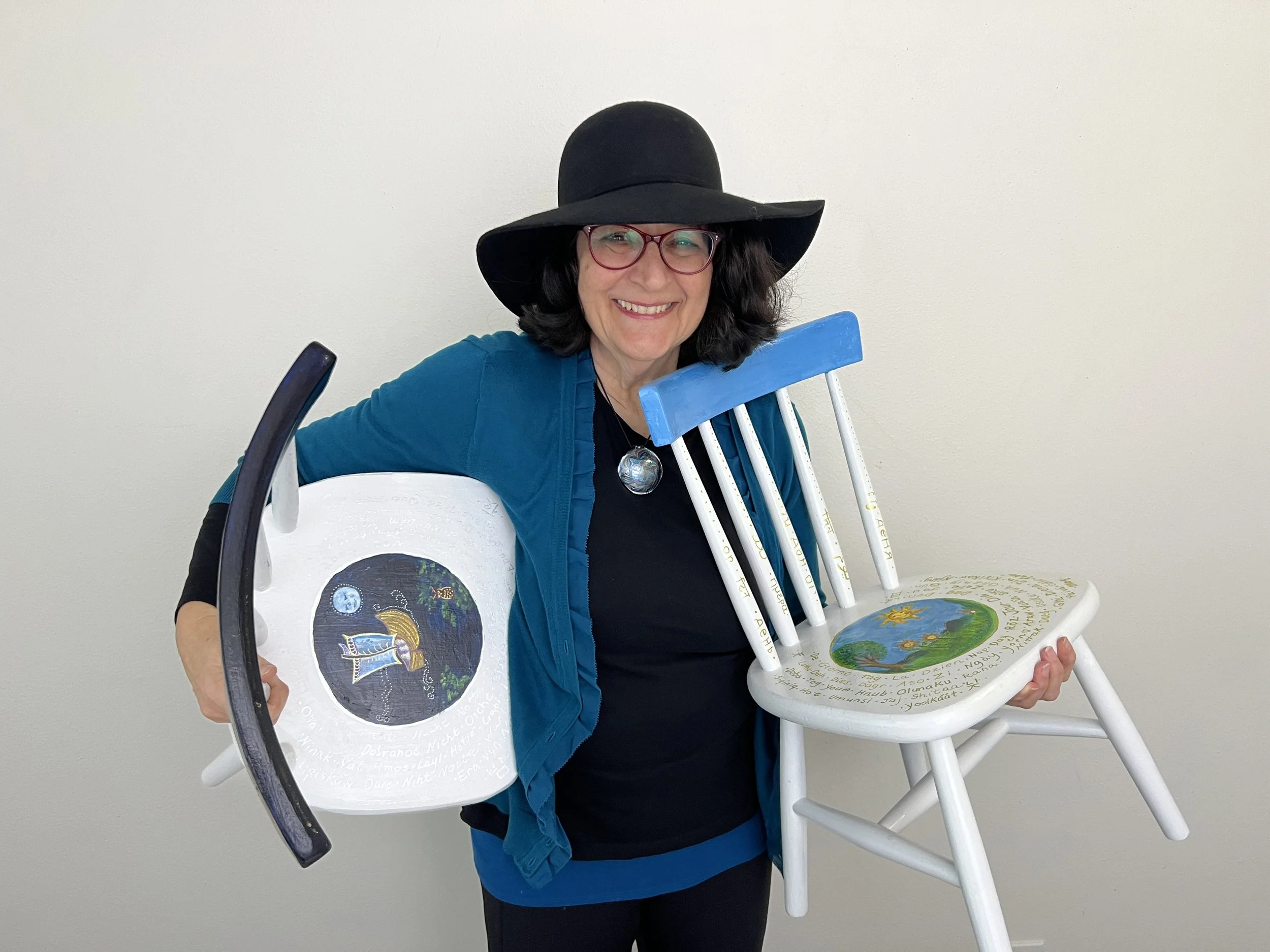 On the left are two chiid size chairs I created in November 2024 forThe Community Warehouse 2025 Chair Affair Fundraiser. Each chair has its own theme. The chair “Day” features the blue sky and the sun. It is decorated with the word day in calligraphy in 77 world languages including Elvish and Klingon. The chair “Night” features Winken, Blinken and Nod as well as a Night Owl. It also has the word night written in calligraphy in 77 languages.