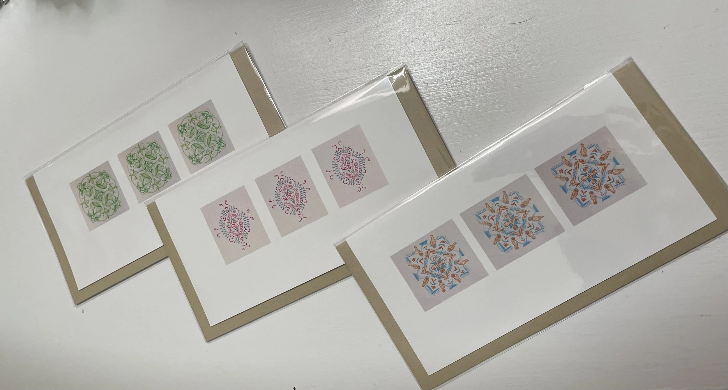 It was the next spring in April of 2023, that I launched Elegantly Frugal Creations with a line of greeting cards that featured my perfectly imperfect meditation mandala colored pencil drawings. The cards are printed locally in SW Portland by Bev Snow-Kuehn of B-Line Enterprises. I added the tea bag art shortly after that first month. Making the collages with found materials is lots of fun.